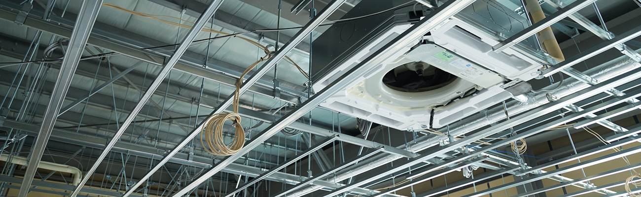 空調はオフィス、病院、学校、商業施設等を対象とした「対人空調」と半導体産業(クリーンルーム設備)、医療薬品製造業、食品工場など、特定の生産環境を実現する「産業(プロセス)空調」の2つに大きく分かれます。いずれの工事においても温度、湿度、気流、空気清浄のコントロールはもちろん、臭気、化学成分、騒音、そして振動までも考慮し、省資源、省エネルギーを実現する高度な快適空間づくりが求められます。
